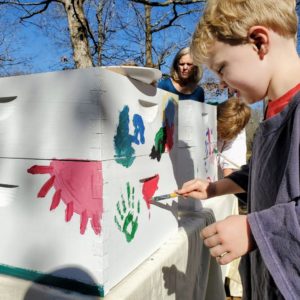 One last thing on the fun finishes. If painting multiple boxes, keep in mind the boxes will be moved around to different hives and rotated over the years. So if you paint one image that spreads over the face of multiple boxes, keep in mind the sides may not always match up. So you may consider painting a design that doesn’t spread across multiple boxes.