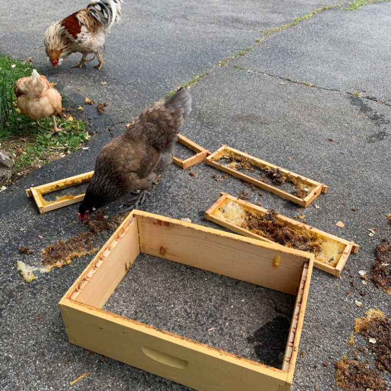 Chickens can also help clean up the frames. They find the larvae to be a tasty snack and will make quick work of getting rid of the moths in damaged frames. They’ll even peck into the holes where wax moth cocoons are in the wooden pieces.
