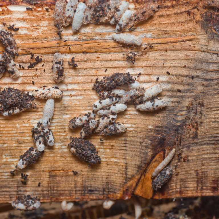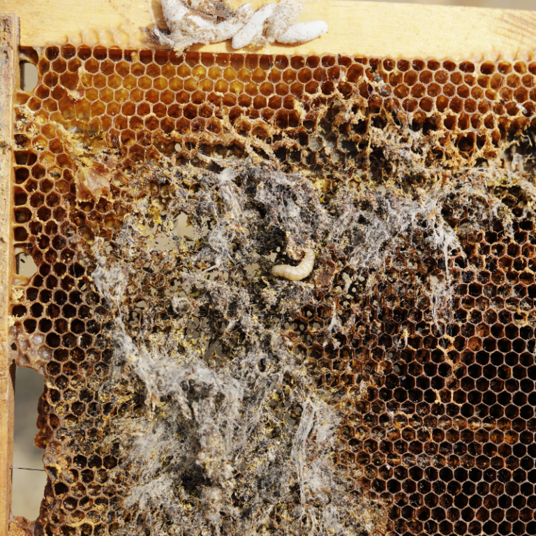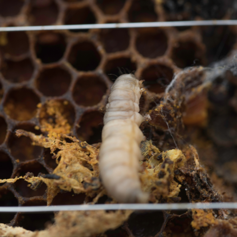 When the wax moth eggs hatch inside the hive, the larvae will tunnel through the comb, eating wax, pollen, bee cocoons and leaving frass (poop) and webs in their wake.