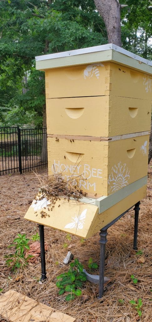 In this colony in the picture, it was suffering from a robbing situation where the entrance feeder was attracting robber bees. We removed the feeder and changed it to an internal feeder. We reduced the entrance down to about the size of 2 bees and piled pine straw on the front.