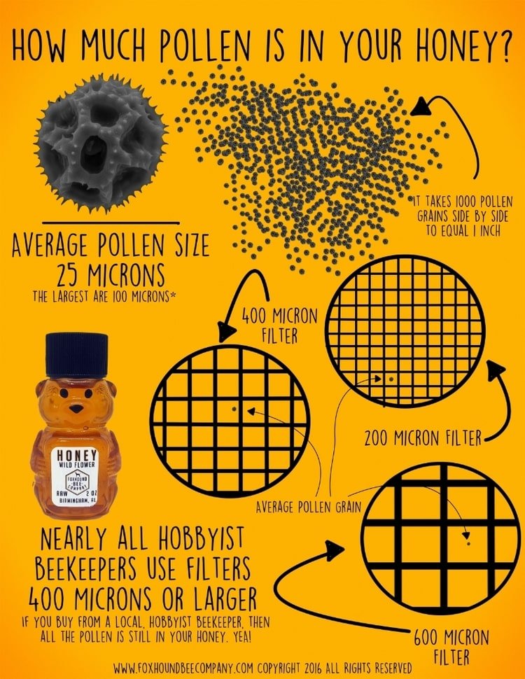 The average pollen grain is 25 microns wide, much smaller than the smallest filter a non-commercial beekeeper will have. Filters designed for straining honey for hobby beekeepers come in three sizes, 200 microns, 400 microns, and 600 microns. These numbers represent the size of the tiny holes in each filter.