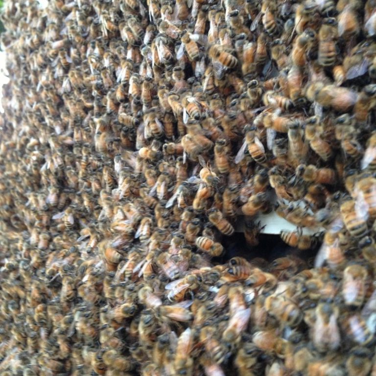 During the nectar or honey dearth, the lack of food in the environment will cause the bees to beard on the front of the hive. Bearding is when you see thousands of bees hanging or sitting on the front of the hive, helping to cool the inside of the hive.