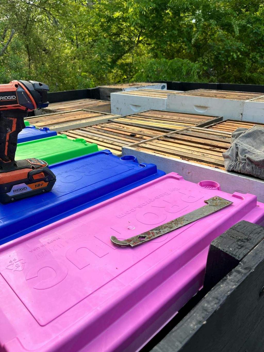 The separate lid snaps tightly onto the nuc keeping the bees inside during transport but can be rotated to allow additional airflow or restricted airflow through the lid. Two feeder options are on either end of the lid and cut be cut open to allow multiple feeder options without having to open the nuc up. If you'd like to request a particular color lid or combination of colors, enter those colors in the notes field during checkout.
