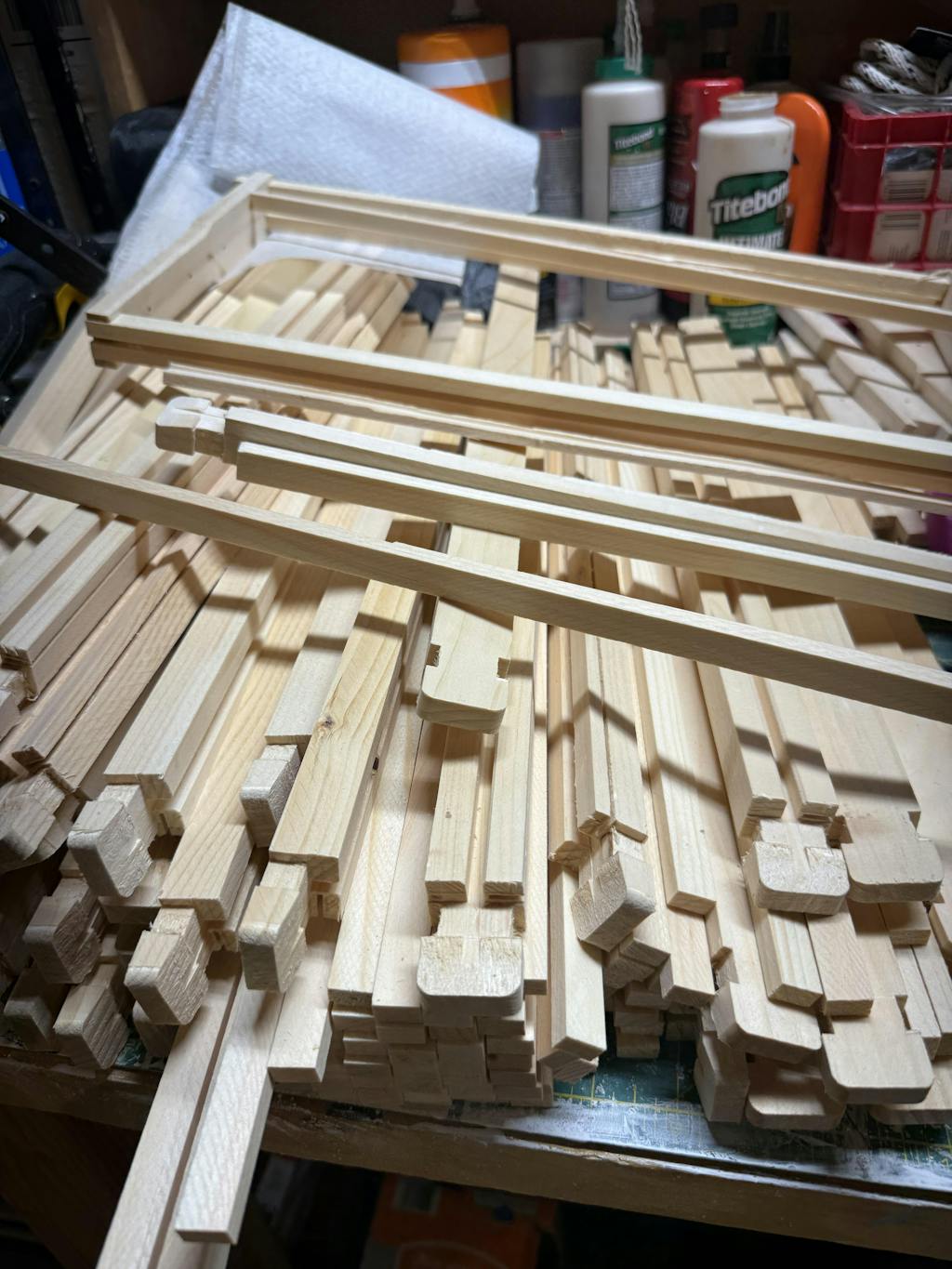 Each frame includes four separate components — a wedged top bar, split bottom bar, and two sidebars with holes — that fit together securely using wood glue, nails, or staples. When assembled, the frame provides a sturdy foundation for comb building and honey storage.