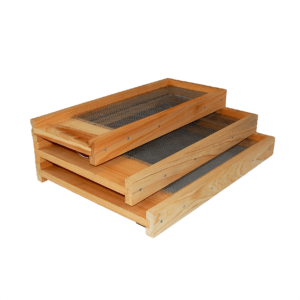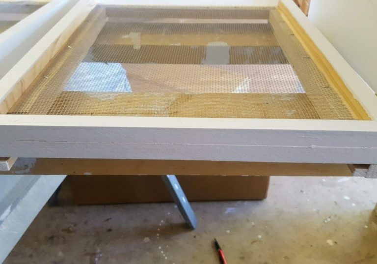 Die abgeschirmte Bodenplatte folgt dem gleichen Design wie die massive Bodenplatte, hat aber nur einen Eingang für die Bienen. Anstatt dass der Boden der Bodenplatte aus einem massiven Stück Holz besteht, ist die Mitte des Bodens mit einem Maschendraht, sogenanntem Drahtgeflecht, bedeckt. Die Löcher im Maschendraht sind 1/8 Zoll groß, was zu klein ist, als dass Bienen hindurchpassen könnten, aber Luft kann leicht hindurchdringen.