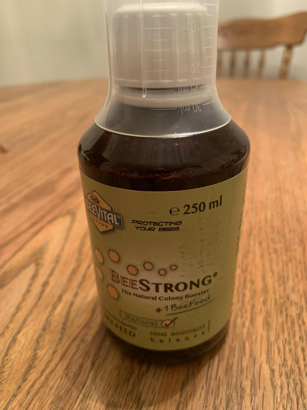 Fütterungshäufigkeit : Mindestens zweimal im Jahr, im frühen Frühjahr und im frühen Herbst, mit einer empfohlenen Gesamtmenge an Konzentrat pro Bienenstock von 50–100 ml pro Jahr.