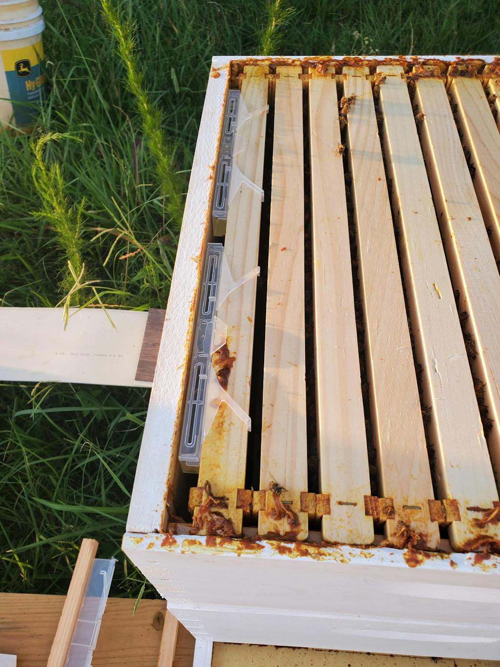 Um optimale Ergebnisse zu erzielen, platzieren Sie 2-4 Fallen in der oberen Kiste zwischen den Außenrahmen und der Seite der Kiste. Kleine Bienenkäfer verstecken sich normalerweise in den oberen Ecken, wo die Fallen platziert sind.