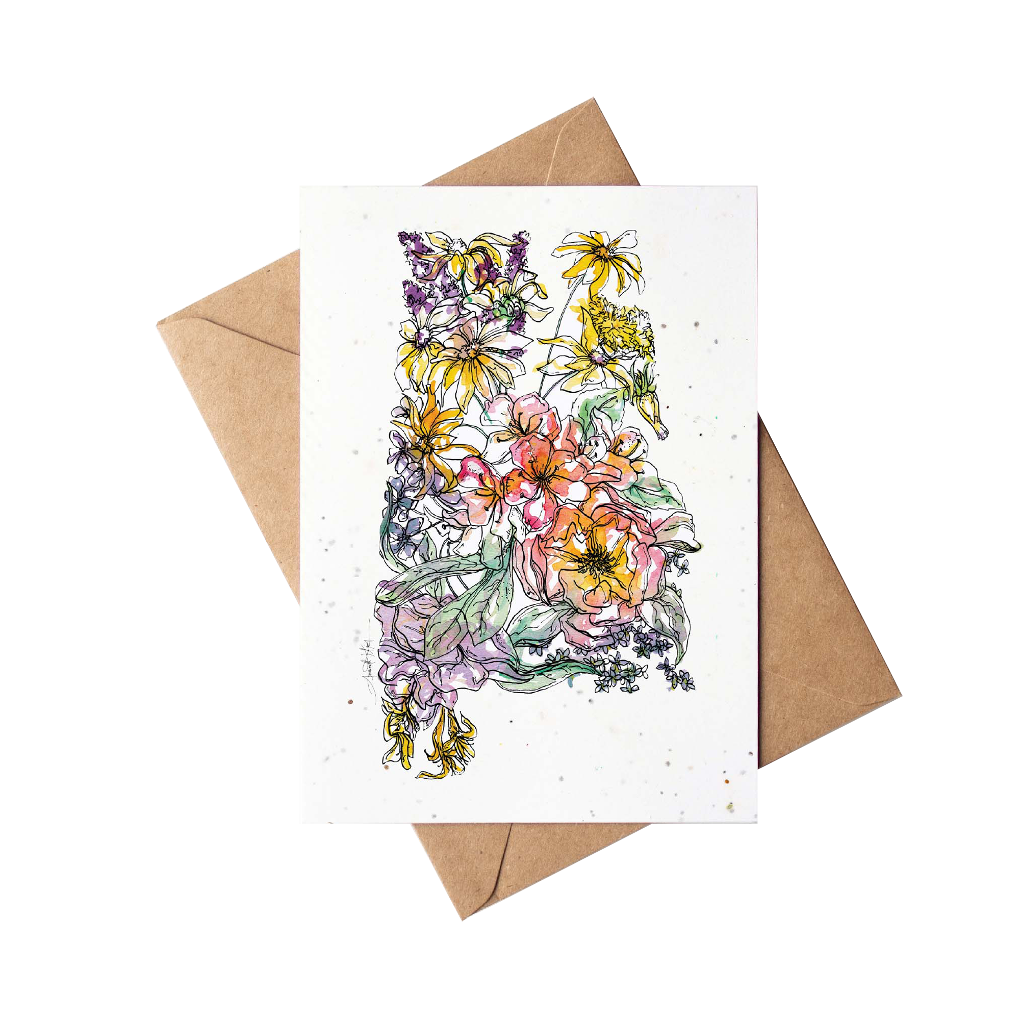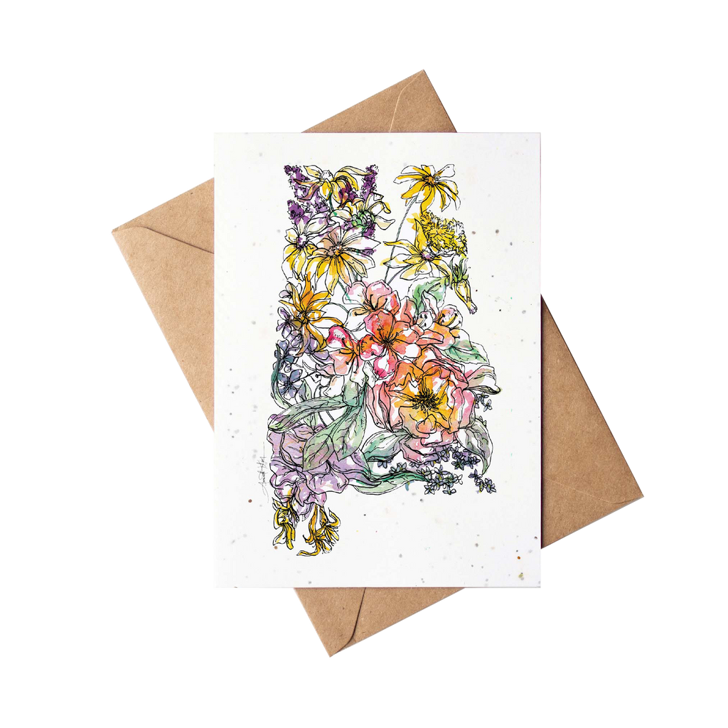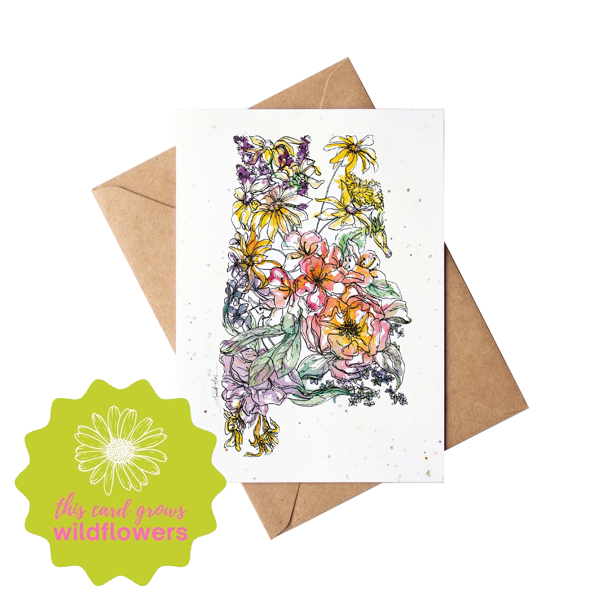 A plantable greeting card that grows wildflowers—printed on handmade seed-embedded paper featuring Amanda Klein’s botanical artwork. Available in three designs.