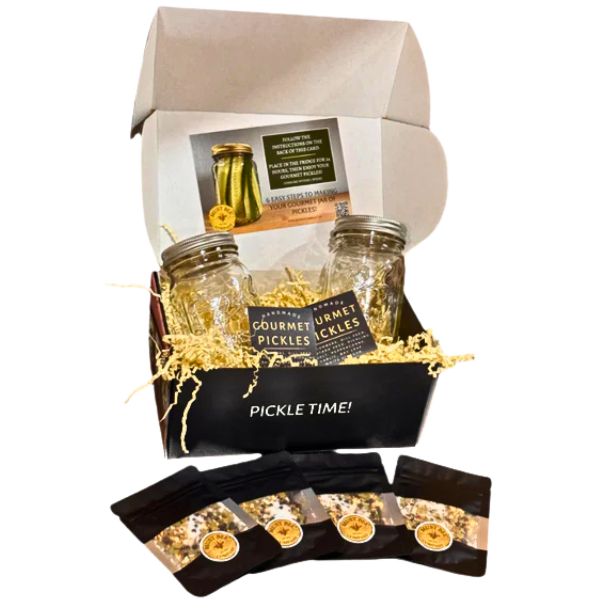 • Complete Gourmet Kit;  Includes two 16oz Mason jars with lids, four individual single-serving pickling spices, two Gourmet Pickle stickers, and an instruction card. Everything you need except cucumbers and vinegar.