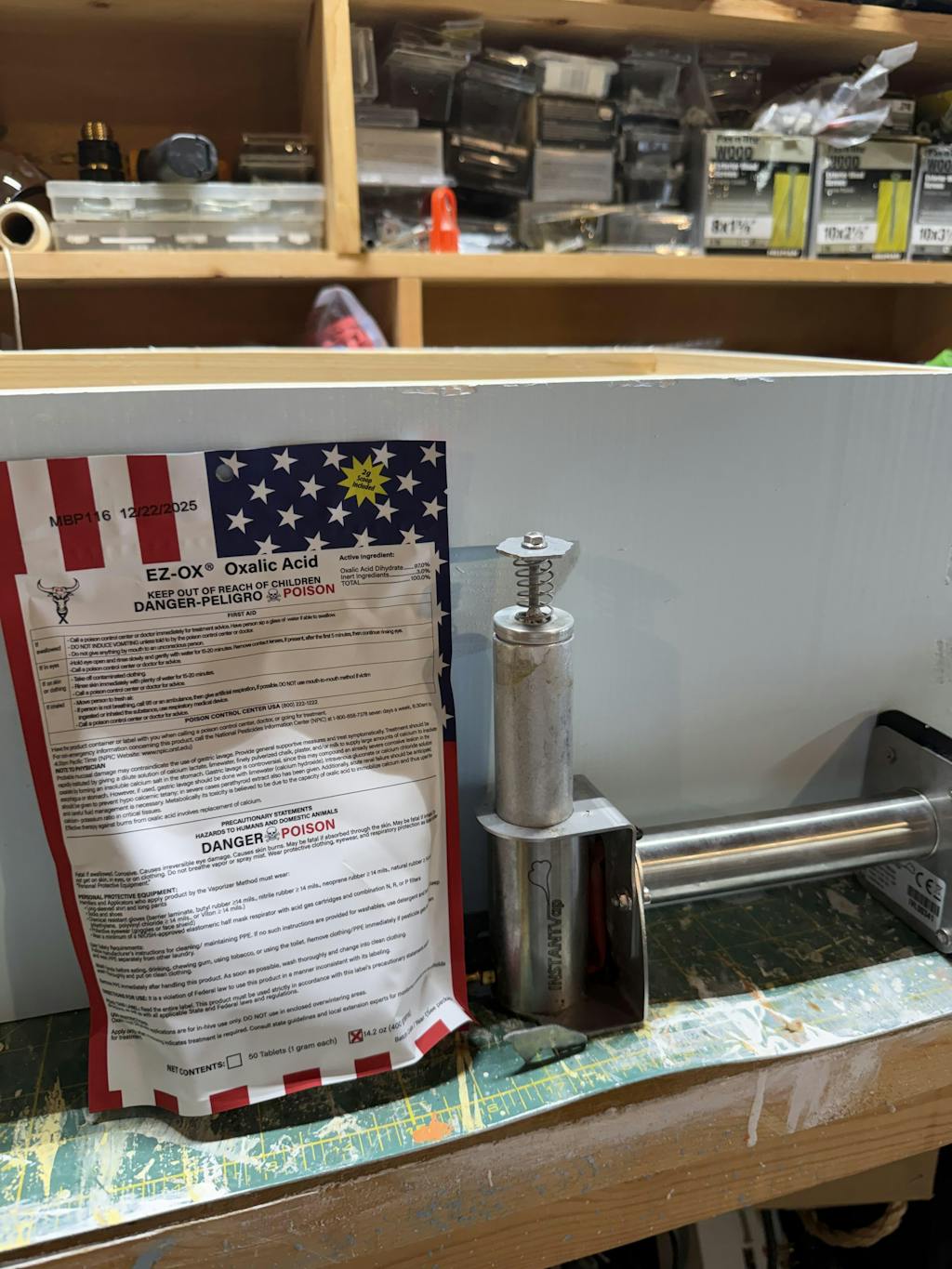 Um Varroamilben wirksam zu bekämpfen, muss Oxalsäure mit einem Verdampfer oder als Tropfen verabreicht werden. Für die Anwendung als Tablette verwenden Sie gemäß Etikett zwei 1-Gramm-Tabletten pro Brutkasten im Verdampfer – es ist kein Abmessen erforderlich. Für die Anwendung als Pulver messen Sie 2 Gramm Oxalsäurepulver pro Brutkammer ab. Wenden Sie Hitze gemäß den Anweisungen des Verdampferherstellers an, bis die gesamte Oxalsäure sublimiert ist. Tragen Sie immer Schutzkleidung und wenden Sie die Behandlungen in gut belüfteten Außenbereichen an.