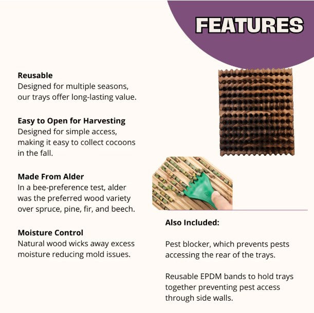 Made in the USA from Pacific Northwest alder wood, these trays combine durability with bee-friendly design. Each tray separates easily for end-of-season cocoon removal and inspection, helping you maintain healthy bee populations year after year. The smooth interiors and lightly burned surfaces ensure a clean, splinter-free nesting space that protects bee wings and encourages repeat nesting.