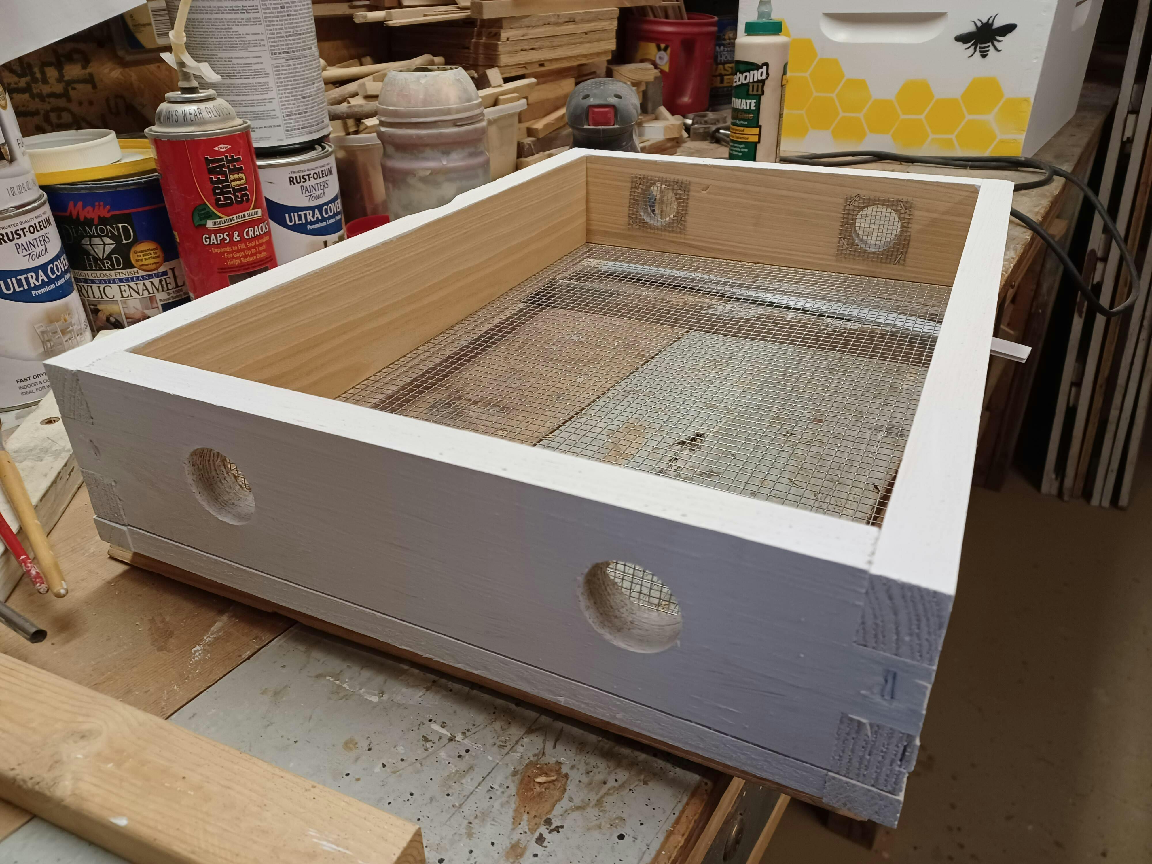La parte superior del borde tiene agujeros pretaladrados cubiertos con una pantalla. Las pantallas se pueden quitar para crear una entrada superior o cubrirse a la izquierda para permitir una excelente ventilación desde la parte inferior de la colmena hasta la parte superior. La parte inferior del borde está cubierta con una gran pantalla que proporciona un lugar para colocar diferentes elementos y permite que las abejas pasen a través de ella. Los comederos, tratamientos y otros elementos se pueden colocar en la pantalla y retirar fácilmente sin interrupciones ni derrames.