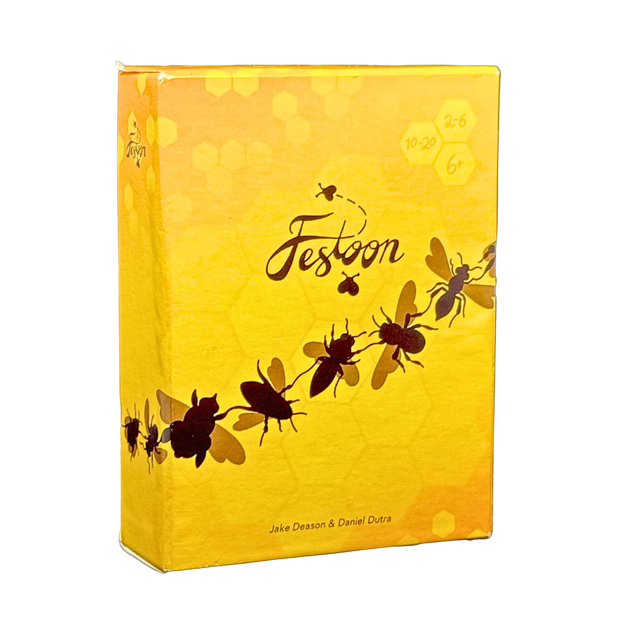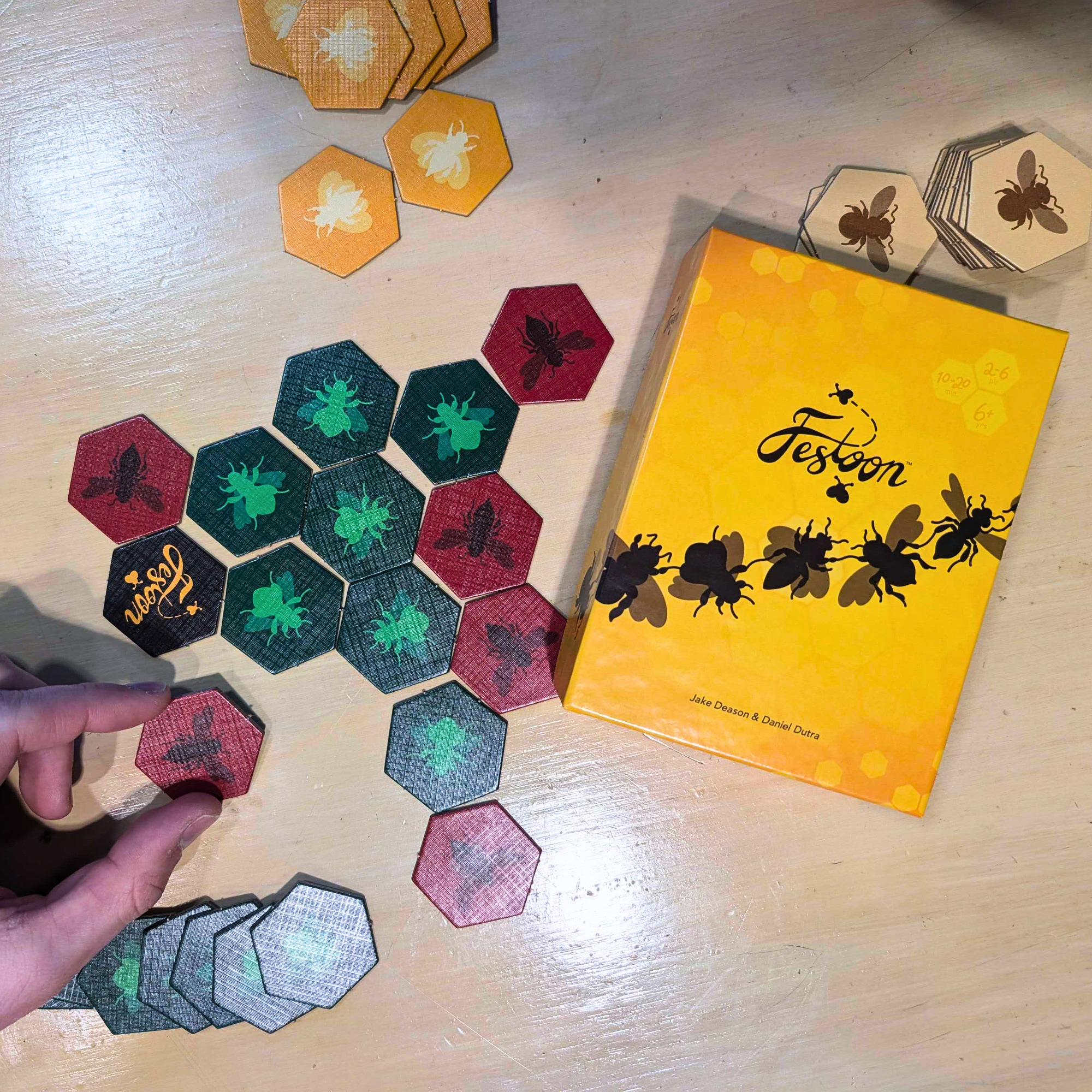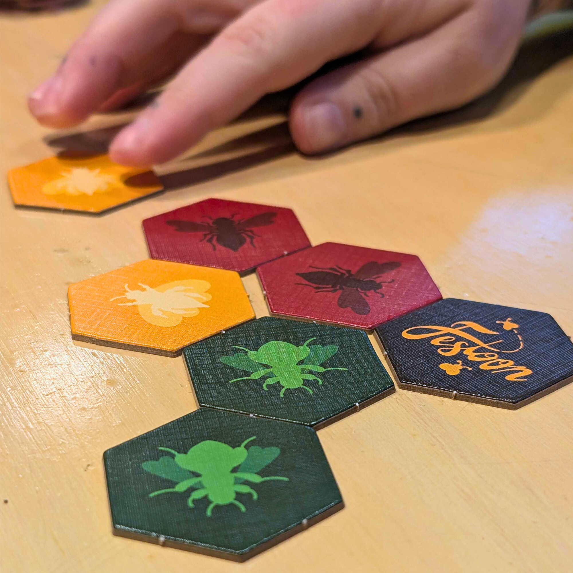 Festoon is a fast-paced tabletop game inspired by honeybee behavior, where players race to form a “festoon” by aligning bee tiles in a straight line.