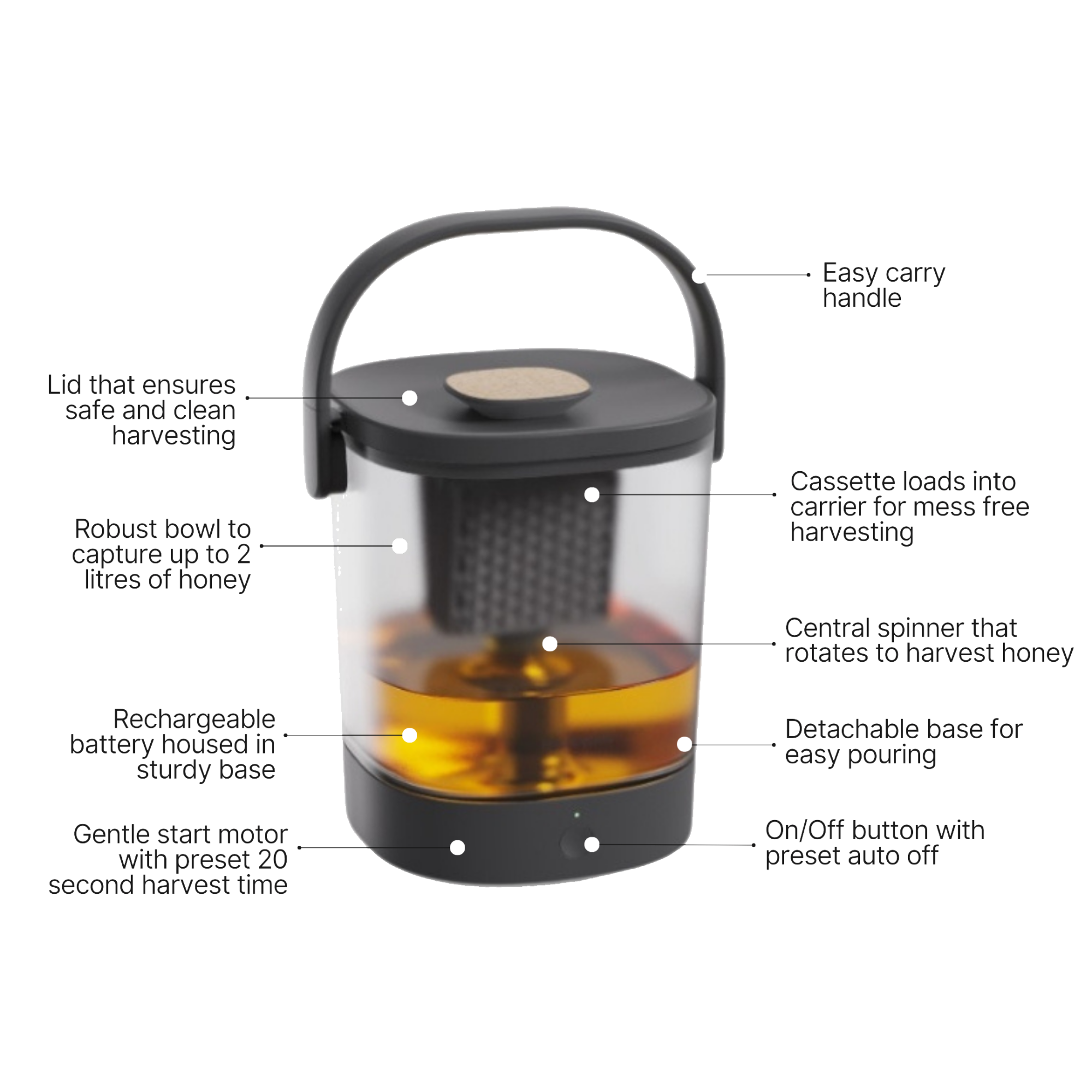 Compact, USB-C rechargeable honey harvester designed for fast, clean harvesting directly from frames without uncapping or bulky equipment.